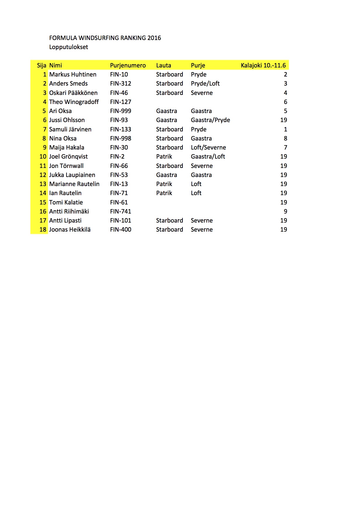 Kauden 2016 Formula-luokan rankingin kärkisijat kertovat pitkästä kokemuksesta. Ranking-voiton vei ansaitusti nimiinsä Formula-luokan konkari FIN-10 Markus Huhtinen. Pitkän linjan pioneeri FIN-312 Anders Smeds purjelautaili toiselle sijalle, FIN-46 Oskari Pääkkösen surffatessa kolmanneksi. Onnea voittajille!